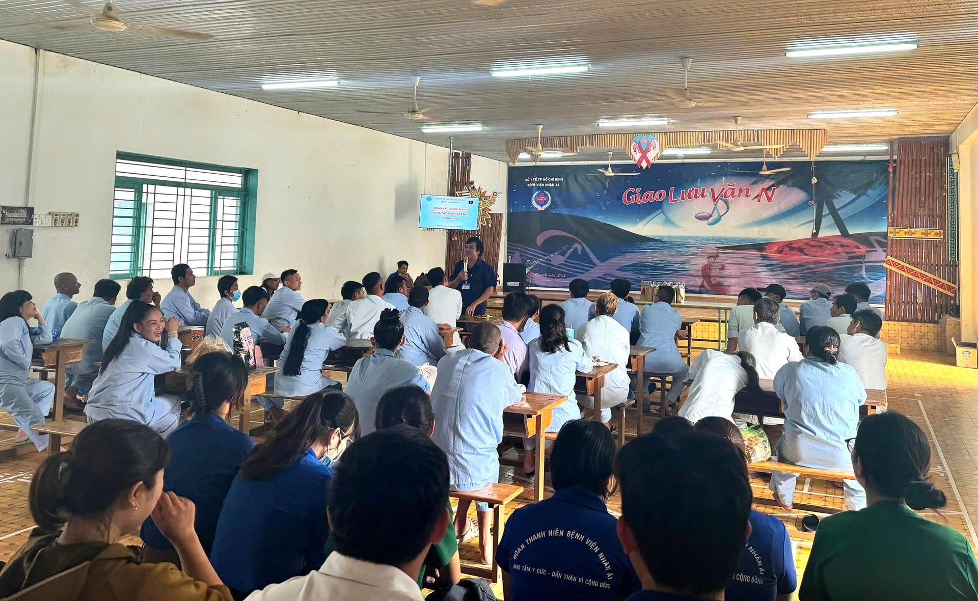 Sau phần truyền thông kiến thức, bệnh viện tiếp tục tổ chức các hoạt động giao lưu nhằm tạo sự hứng khởi cho người bệnh. Trò chơi “Hái hoa dân chủ” với các câu hỏi liên quan đến HIV/AIDS giúp bệnh nhân ôn lại kiến thức một cách nhẹ nhàng và sinh động. Bên cạnh đó, hoạt động hát Karaoke mang lại bầu không khí vui tươi, giúp bệnh nhân thư giãn tinh thần, tăng cường sự gắn kết trong quá trình điều trị.