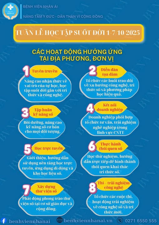 Tháng 10/2025 tại Bệnh viện Nhân Ái là một chuỗi ngày sôi động với nhiều hoạt động truyền thông ý nghĩa, không chỉ hướng đến chăm sóc sức khỏe thể chất mà còn nâng cao tri thức và kỹ năng số cho cộng đồng. Với phương châm "Nâng Tầm Y Đức - Dẫn Thân Vì Cộng Đồng", mỗi hoạt động đều mang những thông điệp thiết thực và giàu tính nhân văn.