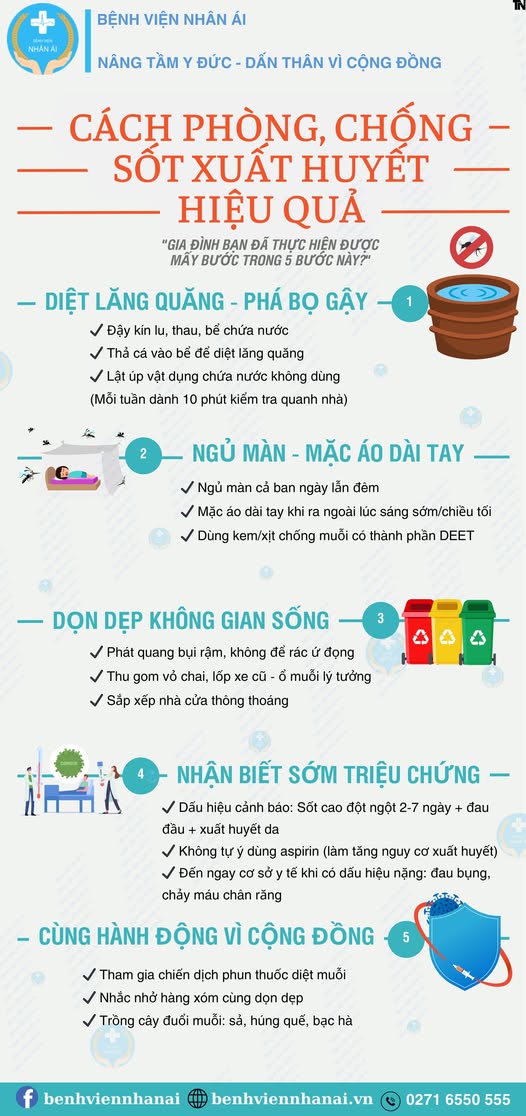 - Phòng chống Sốt xuất huyết & Bệnh do muỗi truyền: Đăng tải các infographic chi tiết về 5 bước diệt lăng quăng, nhận biết triệu chứng và các biện pháp phòng ngừa chủ động.
