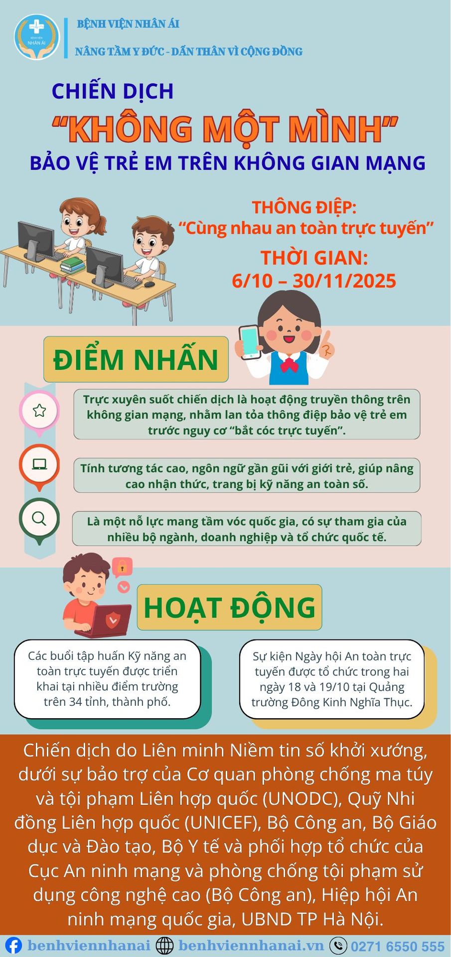 - Chiến dịch "Không Một Mình" (6/10 - 30/11): Một chiến dịch quy mô về bảo vệ trẻ em trên không gian mạng, với thông điệp "Cùng nhau an toàn trực tuyến", bao gồm các hoạt động tập huấn kỹ năng và sự kiện cộng đồng.